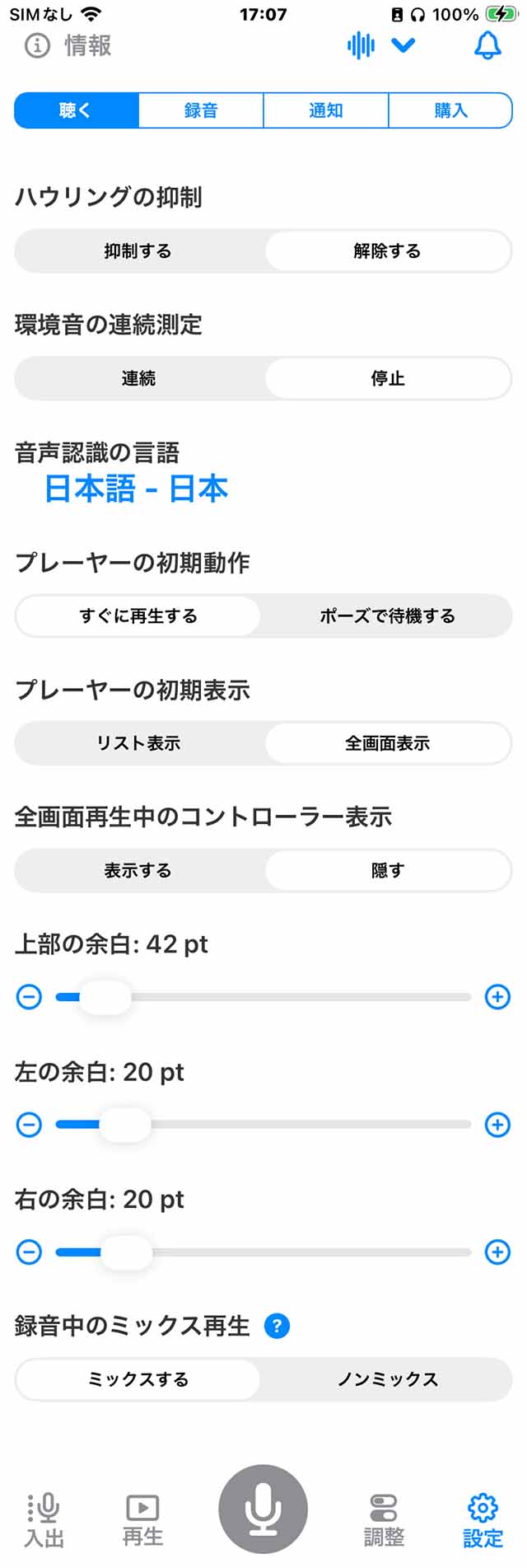 設定には「聴く」、「録音」、「通知」、「購入」 のグループがあります